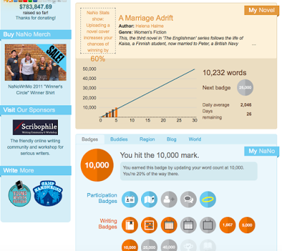 On Friday after I'd reached 25,000 words and got myself another badge (hurrah), I decided it was time to have a bit of a celebration. After a very late night with friends, Saturday's word count was the lowest to date, just below the 1,000 mark. No more celebrations and late nights I decided, and on Sunday I managed my usual 2,000 words.