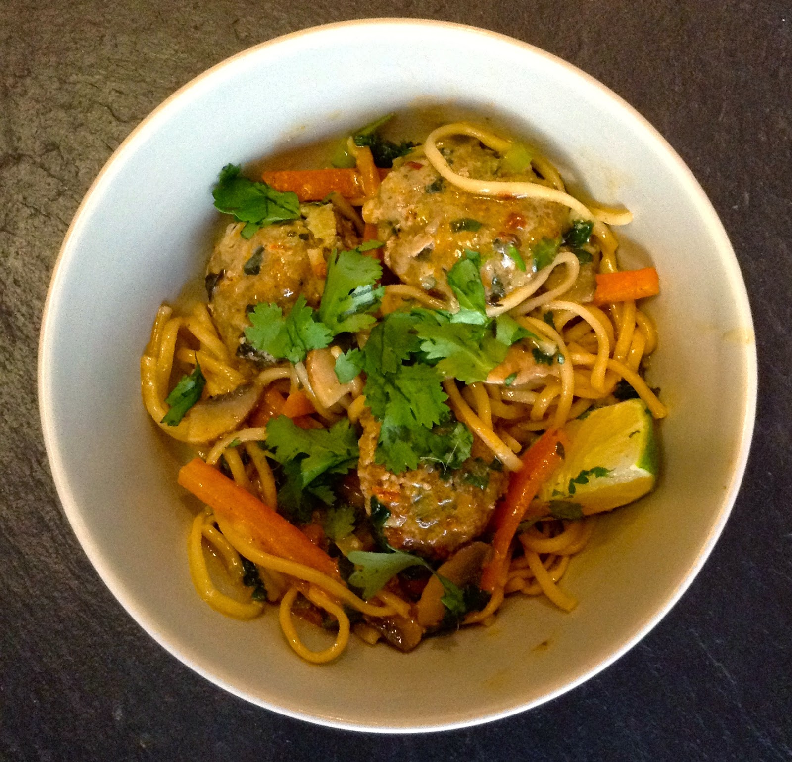 one teaspoon vegetable oil1.5 tablespoon red Thai curry paste,tin of coconut milk1.5 litres of vegetable stock250 grammes packet of medium egg noodles1 teaspoon of brown sugarA carrot cut into matchsticks3 chestnut mushrooms thinly slicedSpring onion, cut in half and finely slicedHandful of coriander, finely choppedLime juice to tasteThai basil, finely choppedWhile the pork meatballs are cooking, start preparing the broth and noodles. Heat oil in a large pan and fry the red Thai red curry paste for a minute or two until there's a strong scent of spices. Add the coconut milk and vegetable stock. When the broth comes to boil, let it bubble for a couple of minutes. Next, add carrots and cook for 5-10 minutes according to how small the matchsticks are. Add mushrooms and cook for a further two minutes. Finally add the noodles and cook according to packet instructions (mine took 4 minutes).