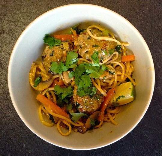 For some reason I've been craving Thai flavoured pork meatballs for some time, and I love noodles, so combining red curry paste and herbs, I made up this recipe. It was so good and popular with Daughter and The Englishman, I thought I'd share it with you.