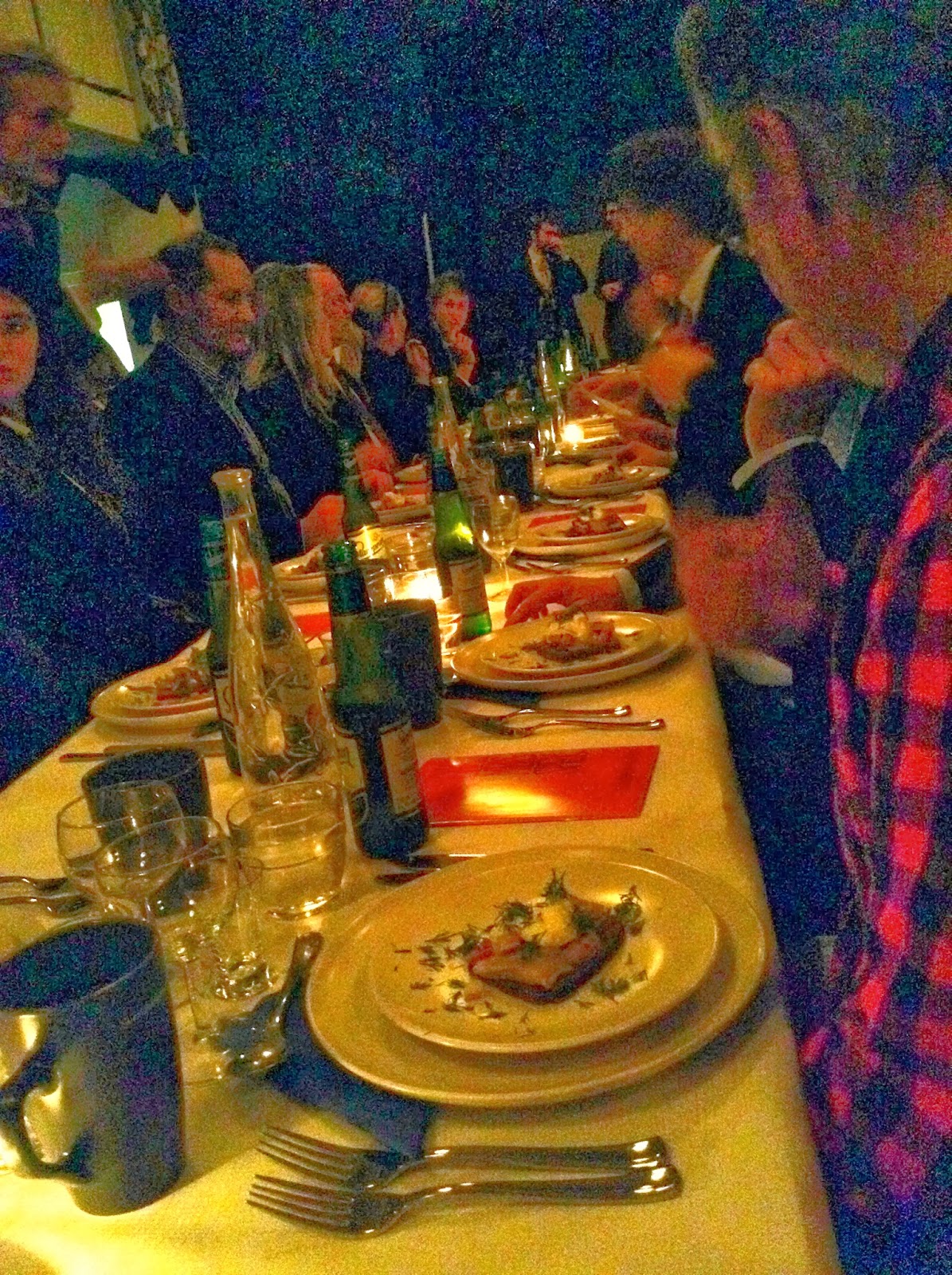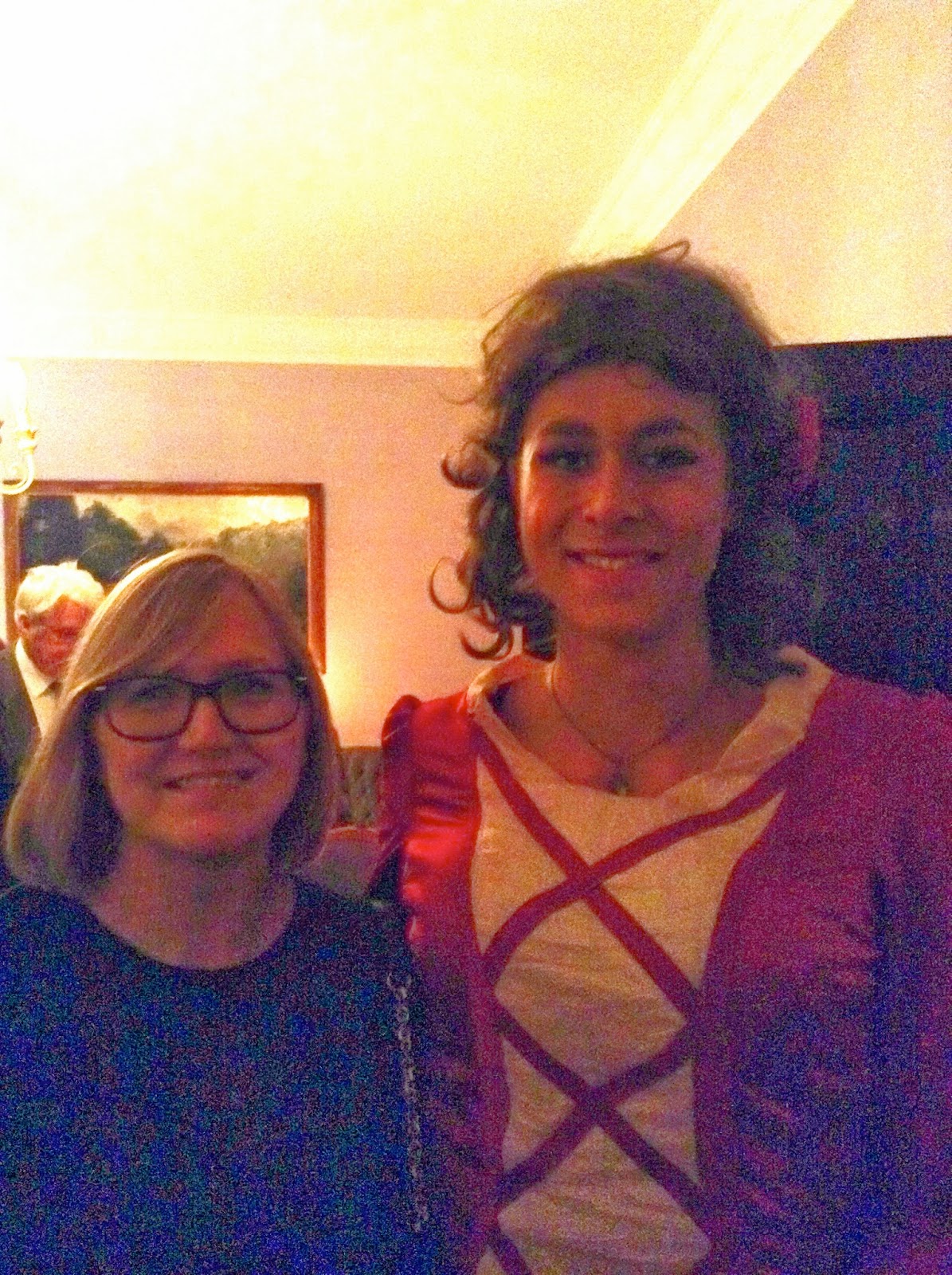 with the very tall leading lady, Oskar FridellDuring the meal of Swedish husmanskost (traditional Swedish foods such as herring and pyttipanna), the cast and theatre company lead the singing of schnapps songs. After many drinks, songs and speeches, and dessert and Punsch (Swedish sweet liqueur), the cast began performing again, singing solos and duets.