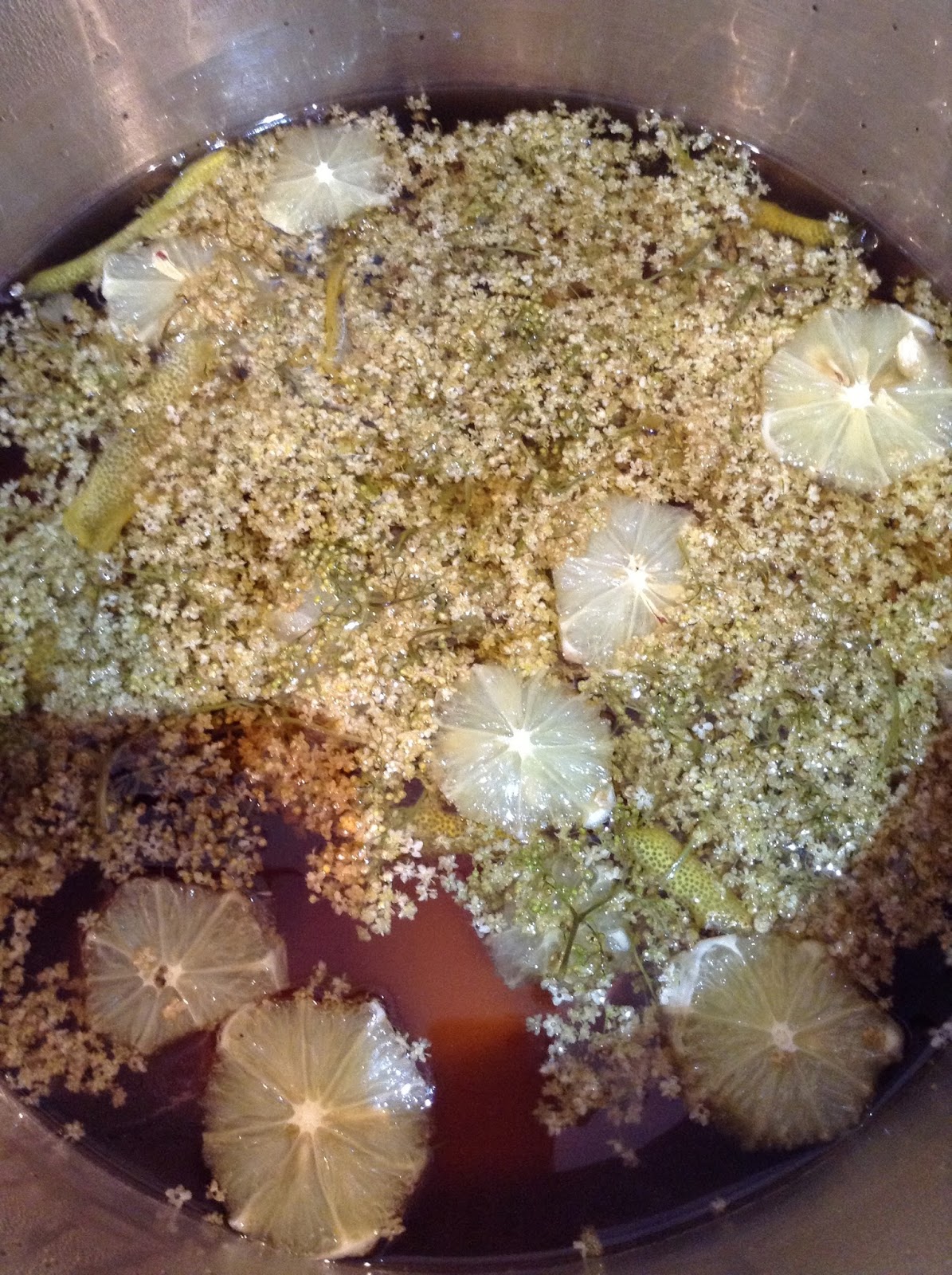 Wash the elder flowers to remove any insects and add them to the syrup too. Give the mixture a gentle stir and leave for 24 hours.