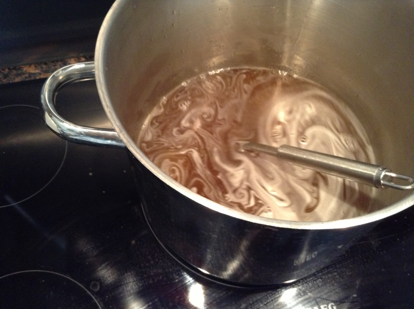 Put the sugar and water into a large pan and heat up slowly until the sugar dissolves. Then boil the mixture up really quickly and turn off the heat.