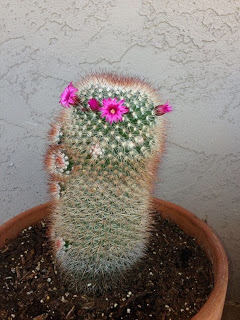 Cactus Joe, photo by me. Cactus Joe has not bloomed in four years (the whole time we were in Colorado). But give him a little sunshine and he shows off by growing a crown. I've had him since he was an inch tall - that was 18 years ago. I always thought he was a barrel cactus, but he has these appendages starting to protrude which makes me think he might be a saguaro...