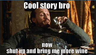 Bronn demonstrating the only way to take GOTThen there was my group…and I’m not quite sure what would’ve been our analog in the show itself. We’re the ones who went into it for the entertainment and stayed with it for the entertainment, happy to glean social or political significance from it when readily available, willing to overlook the occasional plot plop, and content to choose suspension of disbelief over imposition of belief. Rather than a group, we (me!) probably most resembled Bronn, who went through the entire series with a mostly amused grin on his face, taking whatever came his way with a well-honed sense of irony and basking in the end in the bountiful fruits of his forbearance. Thus from my own ironic distance I was able to thoroughly enjoy the show without being too distracted by how fast and loose the creators played with space and time or being too terribly annoyed with Benjen Stark’s too frequent deus ex machina appearances or being too terribly baffled by Cersei’s lack of a baby bump despite at least 6 months of pregnancy at the time of her death. These creative issues along with the superimposed political/social issues from the future* (aka our present) helped stir the conversational pot that was a large part of GOT’s popularity. There was so much to pick apart, chew over, regurgitate…and for us lucky millions to savor from week-to-week. There have now been a number of obituaries written of the show claiming that with its demise we have seen the last of its kind…a cultural event that can engage so many of us at once and provoke a global before-during-and-after conversation. I’m guessing this is a premature judgment, since it has been made many times through human history as storytelling has evolved from the oral tradition to the written word to radio, television and the digital age. But storytelling is inherent and critical to our existence as a species, which is why the producers’ choice to end GOT with a paean to storytelling was so appropriately self-reverential. The subtext of Tyrion’s final, pivotal speech on the value and rewards of storytelling was the creators rightfully patting themselves on the back for managing to pull it off…to tell a story around our modern campfire that kept people engaged--or enraged--but ultimately entertained for more than 8 years. You can’t ask for more than that from a storyteller. *A postscript: