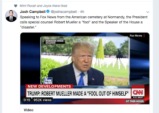 His evident mental illness provides another possible option for a satisfying ending to his MAGAT existence. His lunatic episodes are becoming more frequent and undeniable. In just the past week he called the mayor of his host city, London, a “stone cold loser”; asked for his impressions of the Queen he observed that she walks impressively fast; in a sit down with the Irish Prime Minister he encouraged the Irish to follow his lead and build a wall along their border and when he was told that the Irish don’t want a wall he insisted that they needed one and would be glad when they had one; on a state visit with the serious concerns swirling around Brexit, the EU, NATO, abused immigrant children on the US border, his contempt of congress, breaking the Emoluments Clause and general lawlessness, he found time to send out a tweet attacking Bette Midler as “a washed up psycho”; at taxpayers expense he hauled his ridiculous, uninvited adult children through every ceremonial and substantive event in Britain as if they had any other purpose or skill in life than transmitting his corrupt, privileged DNA from anteroom to anteroom; he explained that he didn’t go to Vietnam because it was too far away, he never heard of it and he wasn’t a fan of the war anyway but maintained that he'd made it up to military by giving it over $700 billion as if it came from the same checking account he paid off Stormy Daniels; and he posed in front of the gravestones of World War II dead with the execrable Laura Ingraham of the state-controlled FOX News to call actual war veteran Robert Mueller a fool.