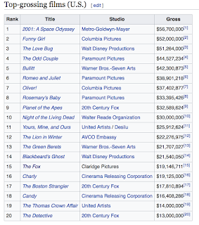 1968 was a big year in my personal life, and as Netflix just reminded me in an email promo, it was a big year in American culture. 1939 is by most measurements the best year in movie history, but 1968 produced more than its share of great movies as a look at the top grossing films of the year in the chart below will attest: