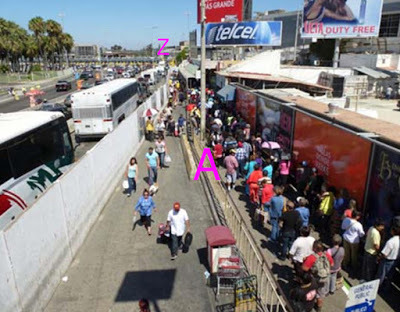 I entered the line at point A and to get home had to get to point Z I was intrigued though by the vendors who were collecting cash from gringos to seemingly lead them to the front of the line. My assumption was that they were employing the rock concert practice of hiring people to stand in line until someone came along to pay for their places. The negotiations that went on were pretty straightforward: the “coyotes” let’s call them would make a solicitation, “Rapido! Rapido!”; a wallet would come out; some alternately nodding and shaking of heads would ensue; then off they would go to where I wanted to be way up near point Z. I watched this unfold in particular with a family of four perhaps from Kansas City based on dad’s NFL head gear and then with two young women in their mid-20s. I couldn’t monitor much more because it was dawning on me that though the line was growing behind me, it was not advancing in front of me and my growing need for a trip to the baños was creating a personal crisis. I can’t tell you how many opportunities I’d passed for a bathroom stop because I was so intent on setting some kind of land-speed record for getting in and out of Tijuana on foot. But suddenly I found myself badly needing to hold my pee and badly needing to hold my place in line at the same time. After almost an hour of going absolutely nowhere, the line took a huge thrust forward. Hope rose, but it only got me to from point A in that picture to just under the covering there. Then it stopped again. I was about to go insane. As soon as I realized the young Mexican couple in front of me spoke English, I asked them what was going on…why the big rush forward and then the abrupt stop again. They explained that US border agents control the flow that way. So as not to allow a mass of teeming humanity at document control, they strictly modulate the forward movement of the crowd. My conversation with these kids yielded a whole lot more. I learned that it’s like this every day…and they should know because they have to cross the border every day for their jobs at a concert venue in San Ysidro. I learned that we probably had another hour and half in line to before getting to point Z. And I learned that the folks who paid for “Rapido” had been scammed by the coyotes who merely brought them forward and placed them in a bogus line in the sun. Sure enough, when we finally got to the entrance to the border an hour and half later the two young women and the family of Kansas City Chiefs fans were there waiting, seemingly oblivious to the fact that they had been taken. Also, most importantly, my new friends held my place while I went to the baños. It is ill-advised to draw too many broad conclusions from an anecdotal story like this, but I had plenty of time to ruminate, so here’s some of the product of that:This flow of labor and lives over the border will endure the current insanity. When I asked the kids if they faced more difficulties as Mexican workers in the US these days, they said they didn’t…that most of their co-workers were Mexican, as was their boss. Their resilience in facing this line on a daily basis also struck me as a strength that will not be worn down any time soon by a raving lunatic in the White House.At the entrance of document control itself, the guard let the kids go to the next open window first over the strenuous, vocal objection of the elderly gent with a SENTRI pass, which entitled him to preferential treatment. Since he also appeared Mexican, there didn’t seem any racial animus at work. It may have been the guard’s way of asserting some authority over a person of privilege…even if it was just brown privilege.This take was reinforced by the treatment the Mexican police gave the gringos who had paid for “Rapido” service. The kids told me the police make a point of stalling their passage because they know they’ve paid for special treatment and such bought privilege marks them for abuse far more than their Americanism does. I don’t know if these are observations you can take to the bank, but I did take them to the baños and it felt good.