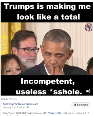 But allow me, please, to explain why the outrage I found in the video I came across posted on Facebook and represented in the photo above is transcendent outrage. Let us dispense first with the ordinary outrages conveyed in that picture/video. There’s the illiteracy of course: “Trumps is making me look like a total Incompetent, useless *sshole.” Is it all the Trumps? Then it should be Trumps are. And Incompetent is capitalized, why? This is shooting fish in a barrel, so let’s move on to the partisanship. Obama’s being attacked because he’s a Democrat. That’s mid-level outrage…the Internet is full of liberal attacks on Trump because of his politics, so no tears for Barack Obama here. But, stop...wait...how about the outrage of racism? Is Obama being attacked because he’s black? Maybe so, but it’s no more than implied here, which mutes the outrage on that score.