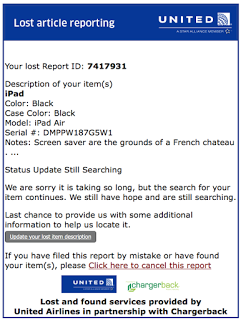 Perhaps there are other voters who, like me, take a bit of perverse comfort in the serial investigations of Hillary Clinton. For instance, I actually prefer to fly on airlines after they've been involved in a crash on the belief that all those maintenance and flight crews are more focused after a disaster strikes close to home. Then once in a grocery store line with a Swanson's chicken pot pie I remembered that Swanson's had just been busted by the FDA for having unapproved levels of rat hairs and feces. So I left the line and went back to the freezer and swapped my Swanson's chicken pot pie for a Bird's Eye. But then when I got back in line, I realized that the wake of a contamination scandal was probably the best time to buy a brand. What other company would be more conscientious about rat hairs and feces than Swanson's?That view has been borne out by our subsequent experiences with United. The airline has clearly upped its game in terms of customer consideration, no doubt as a result of the backlash against it. You can sense it when you call to make reservations, check in your baggage, change flights or seats at the gate. For the time being, United seems to be on its best behavior. That became abundantly apparent with my lost iPad. Frankly, I viewed filing my lost item report as sending off a note in a bottle. From the outset, however, United let me know they were taking the loss almost as seriously as I was (almost). They sent me emails once a week updating me on the progress of the search...here are two of them: