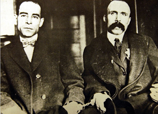 Out of that period emerged one of the most famous murder trials in American history…the trial of Sacco and Vanzetti, two Italian immigrant anarchists accused of killing two innocent men during a payroll robbery in Braintree, Massachusetts in 1920. After a controversial trial filled with dubious evidence, contradictory testimony and presided over by an openly prejudiced judge, Sacco and Vanzetti were convicted of first-degree murder on July 14, 1921…95 years from this posting. Their convictions aroused worldwide street protests and ringing condemnations from some of the most famous names of the time. Among them, this from H.G. Wells: