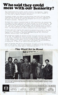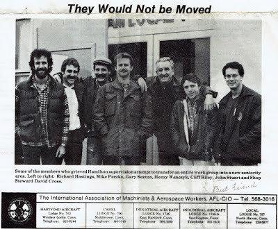 My dad, Cliff Riley, third from the rightUnionism was a big part of my years growing up in the 1950s. My father, Cliff Riley, was active in organizing the union at the Bigelow Sanford Carpet Company, which was the largest employer in our town of Thompsonville, Connecticut, at one point employing more workers than the entire population of the town. To escape the union, the company, like many others in the industrial North and Northeast, fled South in the 1960s to what were euphemistically called "right-to-work states," which were in actuality anti-union states. That was surely the most traumatic union-related event in our family history. The one detailed in the union newsletter below simply shows that Dad was still doing his Norma Rae thing more than 20 years later...and for that I remain immensely proud of him.