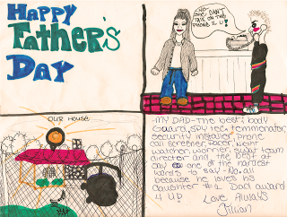 This year Father’s Day is nicely timed to come along as the nation is in hysterics over the spread of the national security state. After all, as Daughter Gillian’s Father Day’s card for me nearly 20 years ago shows surveillance and dads go together like hot dogs and baseball. As you can see from her drawing, I prepared her well to live in a paranoid’s paradise—there’s the barbed wire fence, the guard dog, the light tower…even a black helicopter, showing really how precocious my little girl was.