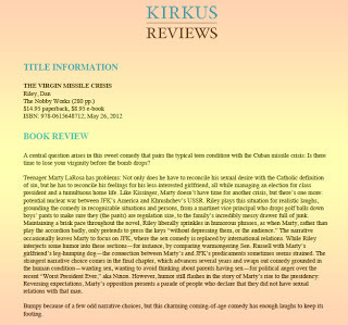 So please allow me to amplify the first professional review of The Virgin Missile Crisis, reproduced at the top of this post (click on it for a bigger, better read). Kirkus Reviews calls the book "sweet." Like most authors, I prefer words like stunningor brilliant to describe my work, but sweet will do. Besides, the book is sweet. It's also, as Kirkus says, "a charming coming-of-age story." Admittedly, Kirkus is not terribly sold on my ending. But I can live with that, especially since it echoes the criticism leveled at the great American novel--The Adventures of Huckleberry Finn (and, yes, I did just go there). Critics have scorched Twain for bringing Tom Sawyer into the novel at the end and turning what had been a deeply probing dissection of American hypocrisy into a farcical boys' tale. Well, it was Mark Twain who first inspired me to become a writer, so if they can fault him for screwing up his ending, they can fault me for screwing up mine. Writers take these plunges without regard to critics...without regards to anything much, really, other than how it feels at the time. (A far more egregious error in the review is identifying a character known as The Worst President Ever as Nixon--clearly a brain fart on the reviewer's part since Nixon in that context doesn't fit at all logically.)