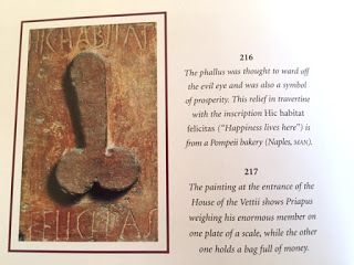 I recently saw a TV ad for a new car in “Pompeii red” and was so mesmerized by that color description that I completely missed what model car it was. As I wrote in a recent blog, I’ve just finished Mary Beard’s Fires of Vesuvius and I’ve become a little dangerous with my newfound knowledge about that doomed ancient city. Just in time for the holidays, I’m now armed with cocktail party level knowledge on everything from Pompeii’s whorehouses to its consumption of garum (fish sauce made from rotted, fermented sea stuff), from its public toilets and smelly streets to its legendary and distinctive red paint…known since the city’s unearthing in the 18thcentury as Pompeii red. As the sensational news of the buried city made its way through Europe after its discovery, one of its initial, albeit superficial, impacts was to make Pompeii red the high fashion color of choice for interior décor among the very rich, as it had been in Pompeii itself. Over time, the color, like much else about Pompeii, revealed itself to be more complex than first impressions would allow. In 2011 a study released by Italian scientists showed that there were multiple variations of red in Pompeii. The most common was actually yellow that was turned red by the fires of Vesuvius. The rarer, more valuable red was a mixture dependent for its richness upon the highly toxic cinnabar, which was not indigenous to the area around Pompeii. It had to be imported from Spain. The Romans, who valued it as highly, originally mined it in Italy, but after it revealed itself to be deadly to both environment and people they outsourced the dirty work to foreigners. The cost of mining and importing it added to its low supply and high demand and forced the Pompeian government do the unusual—enact a price control on how much it could sell for. In her book Mary Beard delights in any details that upend long-standing assumptions about Pompeii. As she says in summarizing her theme, “Pompeii was not the time capsule we sometimes imagine it to be.” Often she relies on new research to question early conclusions about Pompeii as an ancient city captured in time on one fateful day. Almost as often she relies on her considerable powers of critical thinking to debunk past notions about Pompeii. In discussing, for instance, the remnants of a woman found in a gladiators’ barracks she questions the long-held belief that the woman was a prostitute to suggest she may just as well have been a desperate woman who sought refuge there while fleeing the volcano. She applies this distinctively modern feminist perspective to challenge the conventional view of Pompeii as an Italian Sodom and Gomorrah…a stereotype not unreasonably based on the profusion of penis icons throughout the city, its bounty of sexually explicit art* once hidden away by the church in the Museum of Naples' Gabinetto Segreto, and by its glut of whorehouses.
