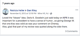 On November 6 of this disappearing year, I received this reminder of a comment to one of my posts from my dear, sweet, sadly departed friend Patricia Heller. There are a couple of notable things about it. The first is that it captures a brief moment in Pat's life when she was engaged in my life and it sounds so fresh and...dare I say...death defying. The second is that it's a reminder of one of the better features of social media, which is that as much as Pat and I corresponded via US mail, the post office would never be able to send me a notice that 7 years ago Pat said this to me. Third, it refreshed my uneasiness about a particular post, called Kisses for my Presidents.