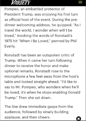 I had been more than a passive member for many years, having contributed a few of my Ronstadt themed blog posts to general acclaim. The reactions to my Variety news item posting were also largely positive…at first. Within minutes I had received Facebook alerts that many people were reacting to it with a heady mix of “likes” and “loves”. Sometime after posting I went back to the page to read some of the commentary the post had attracted. By and large, it was of the "You go, girl” variety…the girl of course being Linda Ronstadt. Somewhere down thread, however, there was the inevitable dissenting voice, which echoed the outrage directed at the Dixie Chicks that they shut up and sing. I then left Facebook for most of the rest of the day to live Dan in Real Life. When I came back at day’s end to check in to see how things were going on Facebook, I found that my original post and all accompanying reactions had been deleted. There was a related post where someone had asked what had happened to my earlier post. Reading through the thread that followed that comment, I learned that in my blissful absence the page had erupted into what used to be called a flame war between those who approved of what Linda Ronstadt had said to Mike Pompeo about Donald Trump and those who either disapproved of what she said or disapproved of having the peace and tranquility of the Linda Ronstadt Collective disrupted by nasty politics. I wanted to add my two cents to that discussion, but found that the administrators had locked comments on the subject. So I turned my two cents into a new post in which I argued reasonably (you’ll have to take my word for this since the post no longer exists) that:Linda Ronstadt was more than a collection of songs and pictures and object of fan adoration…she was a fully evolved human being with multiple aspects to her personhoodGiven her medical condition and the circumstances surrounding her comment, if she chose to use what few words she had left to her in that venue to make that statement, it was obviously important to her and should be valuable news to those who admire herIf anyone disapproved of the politics of her statement that disapproval should be directed at Linda herself and not at those who merely approved of what she said The next morning I awoke to find that I had been thrown out of the Linda Ronstadt Collective. This was not the first time I had been thrown out of a social media site over politics*, but though I was able to laugh off the earlier instance, this one stung. It stung because over the years I had derived great pleasure from a page dedicated to a person I truly adore. It stung because it arose out the same myopic view of politics that spawned the Good Germans I had blogged about passionately. And it stung because the ban came without warning and was, I believe, totally unfair. Fairness is a greatly under-appreciated human value. Upon reflection, I realized that the administrators of the Linda Ronstadt Collective didn’t value fairness as much as they valued power. In this they are much like those who run Facebook…they have the power over the lives of others, but they are powerless to be fair. So with that I am announcing my imminent departure from Facebook.