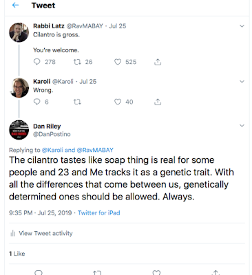 Note that it began with a gratuitously provocative comment about cilantro…by a rabbi no less. It came out of nowhere…a hand grenade tossed into a quietly sleeping village of cilantro eaters to spark conflict and anger. And so it did…all on display in the 278 comments that followed before I came along to try and invoke a little peace, love and understanding. I’m rather new to my understanding of the genetic predetermination of cilantro appreciation and wrote about it in an earlier blog post. So I don’t want to be too hard on the rabbi for not getting that his low opinion of cilantro was formed at birth…nor be too hard for his attackers for not getting that his declaration that “cilantro is gross” is akin to someone born with auditory neuropathy spectrum disorder declaring that Mozart is gross. The bigger issue here is how do we separate things that spring from our nature from things that arise out of our nurturing. This has long been a critical question in forming and managing human community. Things that arise out of nature have to be treated differently than things that are learned. Short of extreme and extraordinary intervention by science and medicine little can be done to change the former, but education and experience can radically change the latter. Surgery can fix a cleft lip; education can help an illiterate to read. Serious problems and infringements on human dignity ensue though when products of nature are treated as products of nurture…gay conversion therapy for a most notable example. A positive sign of human evolution and enlightenment is our growing understanding of genetically determined traits and behavior. The challenge before us is for education to keep up with spreading that knowledge. How, for instance, do we inform both cilantro haters and lovers to know that theirs is not a conscious choice?Unfortunately human history has shown that even the most obvious genetically determined traits have aroused eons of intolerance and abuse along the lines of gender, race, disability, and stature…short people, as Randy Newman once sardonically put it, have "no reason to live". I once had friend, a rather successful actor who too frequently for his own pleasure got cast as a short guy…and not just a short guy, but a short guy whose shortness was often the object of derision in the script. He hated Short People and came to hate Randy Newman for writing it--this, despite the fact that the song is an attempt to “educate” people about not making fun of short people...or anyone else who was just "born that way". The redeeming, instructive verse goes:Short people are just the sameAs you and I(A fool such as I)All men are brothersUntil the day they die(It's a wonderful world)