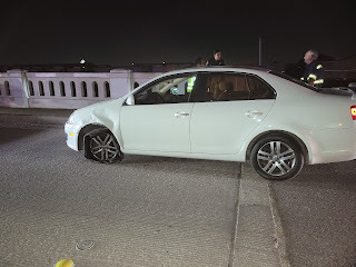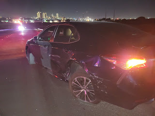 But it gets so so much better. Babe was parked facing South. Dude comes up the road headed North and just wandered to the other side of the road. He hit our car in the back passenger door and because my daughter is ten feet tall, her head grazes the ceiling at all the times and she hit the window, causing a slight concussion. Dude being the gem he is, tries to drive away, but his car was busted too, so he got out of his car and jumped the railing! Dude straight up ran away. Also, the car had paper tags...that were expired.