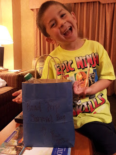 The kids and I drove him to the airport on Sunday evening then filled the next two days with fluff and tomfoolery (and an awesome visit with my sister. Hi Kari!) Anyway, we loaded up the van on Wednesday morning, had lunch with said sister then headed out onto the open road with a thoughtful bag o' treats provided for us by our home teacher ('s wife) because that's just how (s)he rolls.