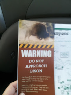 We went to Cap Rock Canyon this weekend, which is near the panhandle of Texas. Even though it's been pretty hot the temperature there was very pleasant and a cool breeze made up the difference. It was very tranquil out there. Also, there are bison. Lots and lots of bison. Since people tend to get stupid around wildlife, the park made sure to post warnings everywhere. EV-E-RY-WHERE.