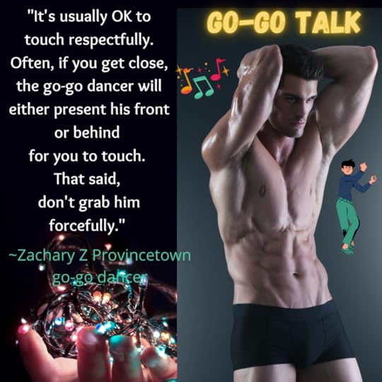 Zachary Zane, a Provincetown MA, go-go dancer, offers words of wisdom for gay men who attend performances. Touching respectfully, according to him, is acceptable, but there are limits. “I told you it was OK to touch, but let’s not take a mile when I gave you an inch…or eight.” In other words, customers shouldn’t squeeze too hard or hang on too long.