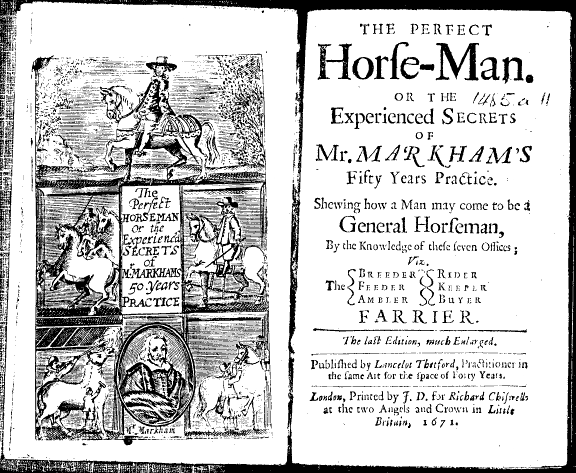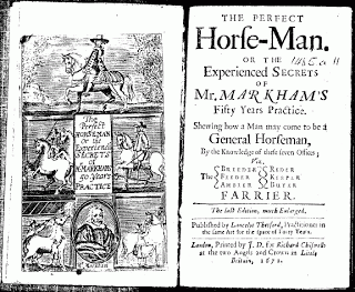 Unfortunately, throughout Markham’s lengthy 200+ pages of advice to the horse-challenged, I could only find one bit of useful information for my purposes. He says: “In journeying, ride moderately the first hour or two, but after according to your occasions. Water before you come to your Inn, if you can possibly; but if you cannot, then give warm water in the Inn, after the Horse hath fed, and is full cooled within, and outwardly dried.” He then went on to say something about applying copious amounts of “dog’s grease” to the horse’s limbs and sinews, but I think I wandered off the page at that point.