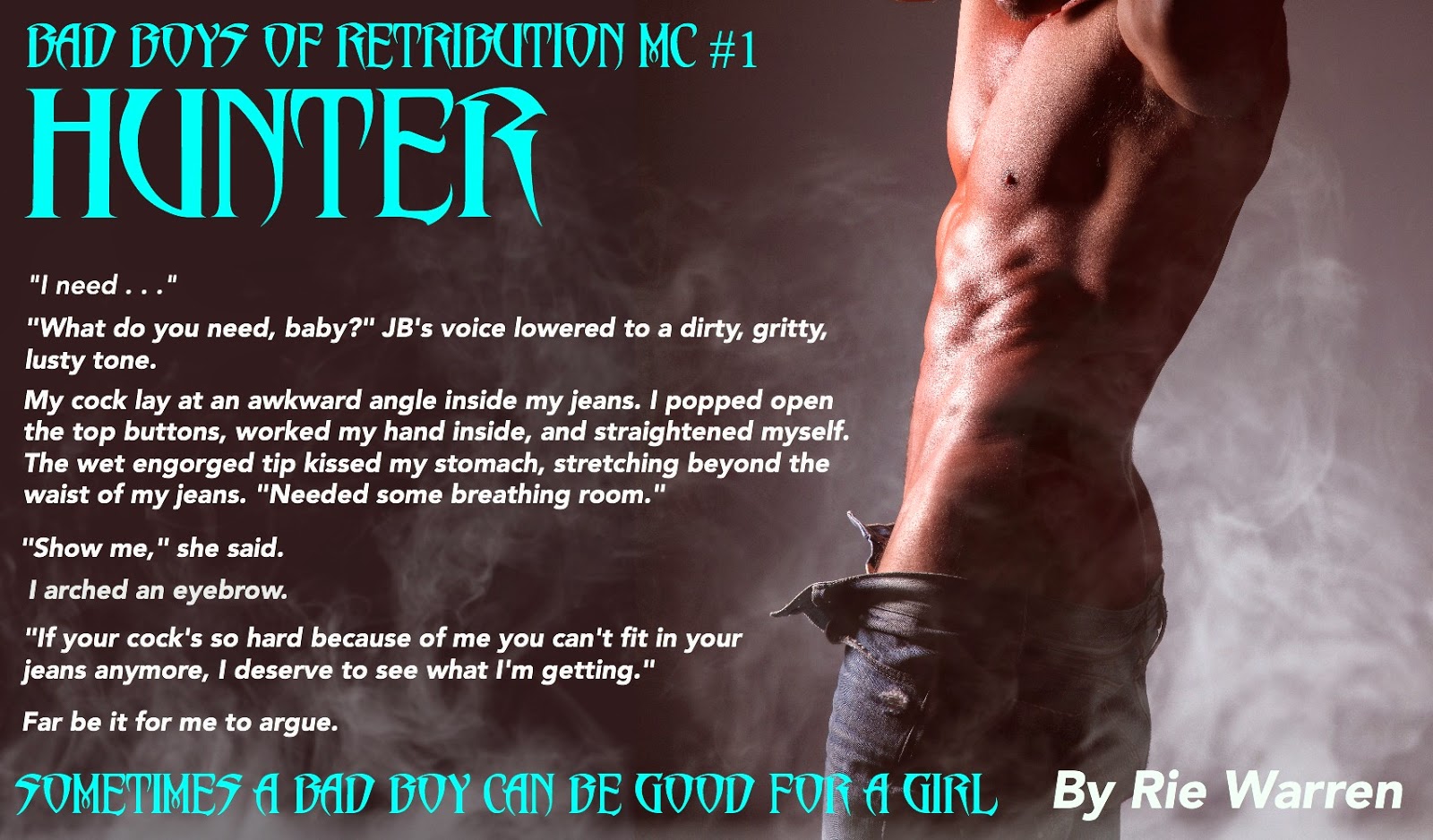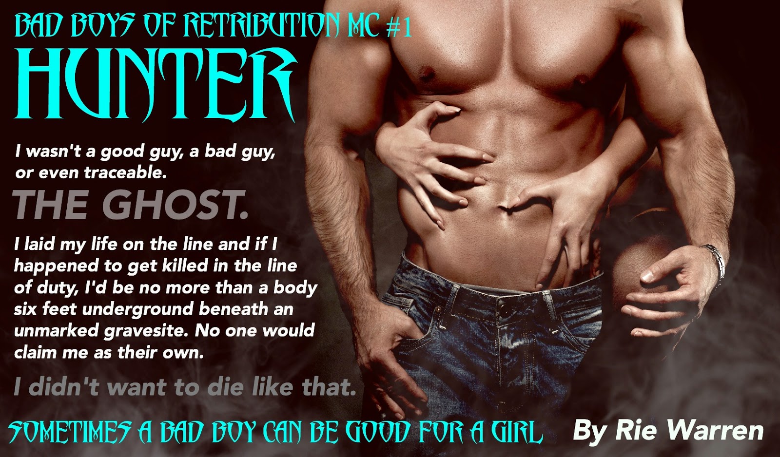 STATS:Title: HUNTERSeries: Bad Boys of Retribution MC #1Author: Rie WarrenPublisher: Rie WarrenGenre: Contemporary Erotic RomancePage count: Approx 150 pagesKeywords: alpha male, biker, southern, humor, mc romance, suspenseDate of release: June 2, 2015List Price: $0.99 cents Preorder link: Goodreads link: Hunter:My call-sign is GHOST. My roadname, too. I keep my head down, stay off the grid, fly under the radar. I’m the rough, gruff, good guy who does bad things for pay.