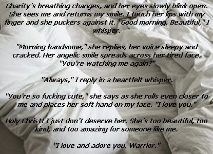 "I'll wait if you want, but I'd rather it be soon. I don't want you to be able to get away from me so easily once you realize I'm not good enough for you," he says, his large arm holding me just a little tighter as if I might decide to leave him now.