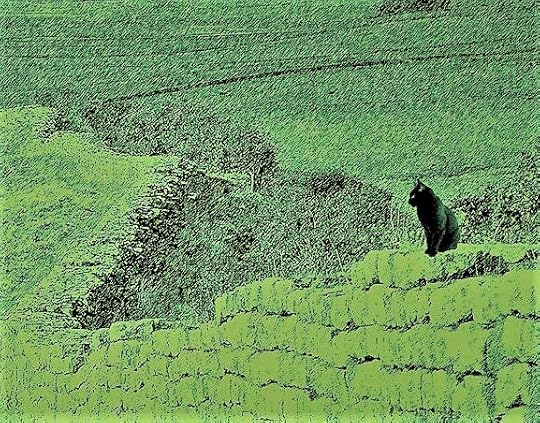 Outside, he resumed his feline shape and sniffed the air for demons. Satisfied he was alone, Anubis shook raindrops from his fur and waited until ‘The Royal Way’ re-materialized as a luminescent green carpet shimmering with power that levitated an inch above the cobbled street. He pawed it cautiously before streaking down the country lane towards a treeline of oak and willow startling a lean fox emerging from a skeletal hedgerow.