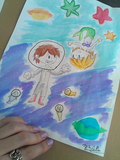 Michelle’s illustration shows both sky and sea, almost blending into one another, but not quite. She painted white dots in the violet space, and colored stars in the blue one. The stars in space resemble stars as we see them, tiny white dots against a dark background. The stars in the sea resemble starfish, or anemone. In a sense, through linguistic signs (not considering definitions), there are stars in both sky and sea.