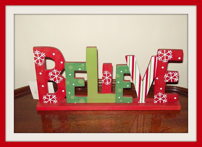 1. BELIEVE sign shelf-sitter. This is made out of wood and has been painted. My believing-self just couldn’t pass this one up! SO cute and pretty big, too!