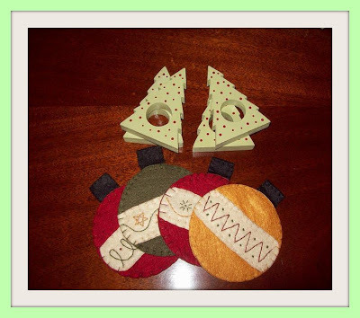 3. FOUR felt ornament coasters and FOUR wooden, painted, & glittered tree-shaped napkin holders. *My mama spotted these. Such a cute touch!*