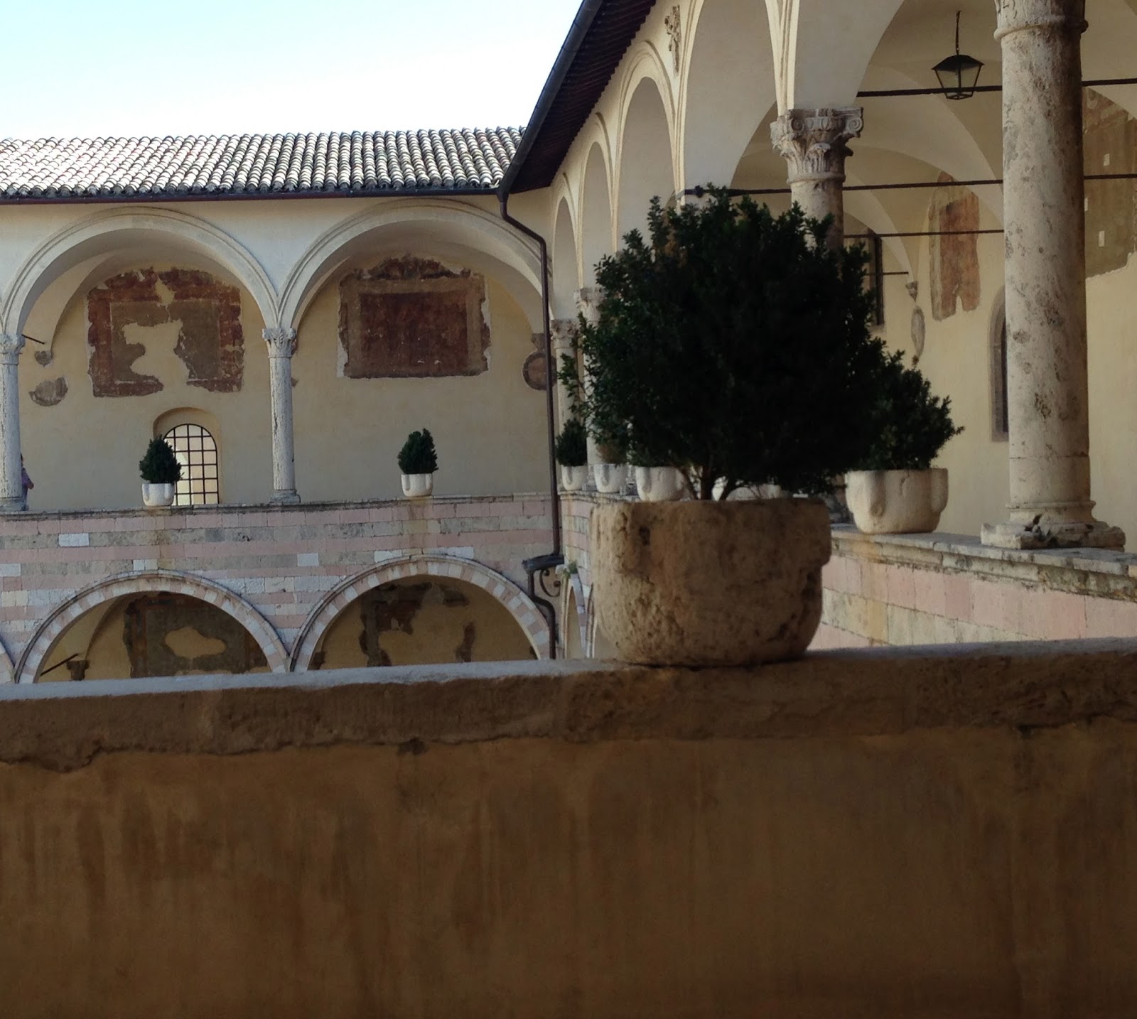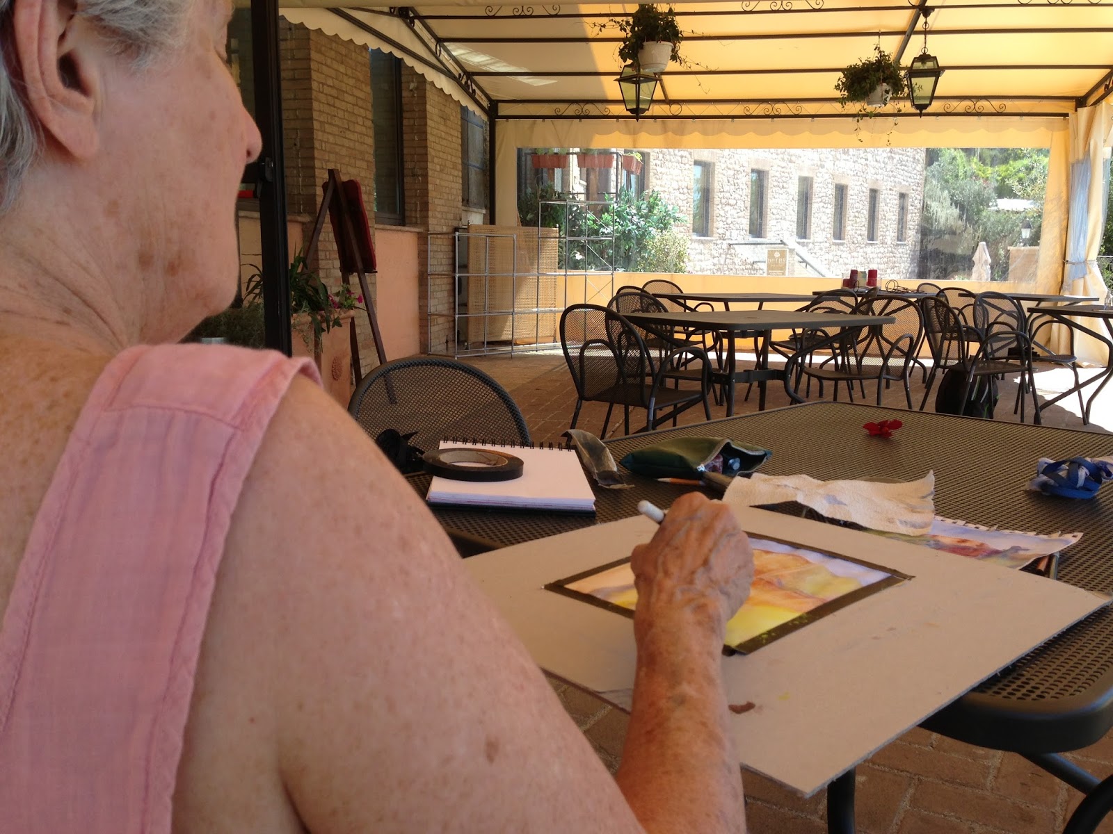 I am a painter for two weeks each summer, at Art Workshop International in Assisi. This year I came feeling uncertain about what I wanted to do, couldn’t quite connect with anything until I spent an hour or so watching Edith Isaac-Rose paint. I sat slightly behind her, so I couldn’t see her watercolors and didn’t have any idea what color she had on her brush until she put it on the paper in a big swath. I was shocked several times, in the happiest way. Yellow! Red!We were on the terrace of the Hotel Giotto, the geometry of walls and roofs before us, broken by trees, flowers, chimneys and, in the distance, the mountains, fields, sky. I could see a vague outline of the scene on Edith’s watercolor paper in the beginning; but in time the particulars disappeared, colors and shapes told each other what to do and Edith, stopping, looking, let them do it.