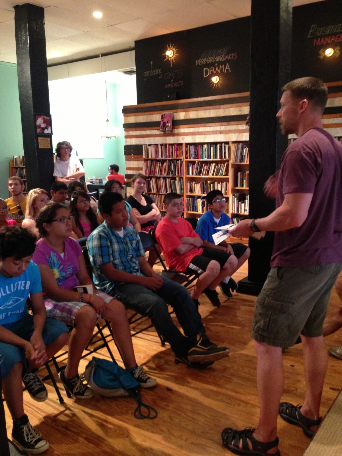 Leeann was working with some of kids that were having trouble concentrating. “You need to get to work,” she said—then thought, but what are the consequences if they don’t. She added, “…because I’m going to be so disappointed if I don’t get to read the stories you have inside your heads.” This surprised them. They wrote. When I was taking pictures yesterday, they all wanted to have their pictures taken with her. I went from St. Florian to my favorite bookstore, IndyReads, where our Latino middle-schoolers from LaPlaza gathered to browse the bookshelves and listen to what three young, very cool real writers had to say about writing. Bryan Furuness, Andrew Scott and Ben Winters volunteered their time to talk about writing when they were kids and writing now.