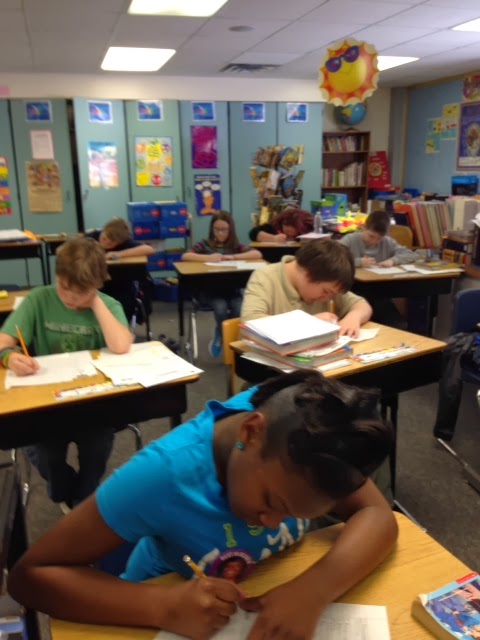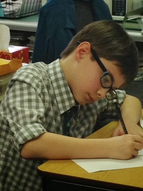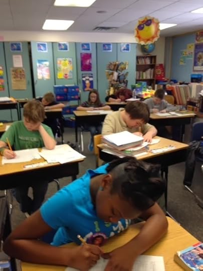 Then I tell them some things I’ve figured out about writing. Everybody has interesting stuff to write about, we have to learn how to trick our brains into finding it for us. Ideas aren’t words, so we have to learn how words work so that we can translate our ideas into stories. Writing gets easier (and way more fun) when you learn how your brain works and let it help you: part of it is made for picturing the story in your mind so that you can just write down what you see; part of it is made for fixing up the story and making it better once you get it written down. Let yourself stay in the part where the pictures are in the first part of writing. Nobody gets a story perfect the first time they write it. Writers re-think and revise. You can go back and look at what you’re written, look for words that you can make more like pictures. Avoid adjectives, use strong, visual nouns instead. Take out adverbs! For example, “walking slowly” might become strolling, sauntering, meandering, limping—depending on how the person is walking and what you want the reader to know. When you get stuck and can’t go on, ask yourself, “What if?” A good imagination is no more than the writer being willing to ask “What if?” until the right thing pops into her mind. Don’t worry about fixing things as you go along. Just write as fast as you can, write everything you can think of--then you can think about fixing them. It’s okay to go off-topic in the first part of writing. Sometimes what feels like being off-topic is just your brain having a better idea about what the story should be. Let it go, see what you’ve got. If the off-topic part doesn’t work in the end, take it out. If you worry too much about getting it right the first time, the pictures stop coming and you get stuck. Remember: writers revise. You can fix what needs to be fixed when you finish getting your story down on the page.Mrs. Brown requires serious note-taking, so most of them were scribbling madly. I love that. We did an exercise that helped them see something they remembered. Then they wrote, not worrying about anything but getting down the pictures they saw in their heads. Watching people of any age do this exercise makes me supremely happy. A particular kind of quiet falls, there’s the sound of pencils scratching. The kids are bent over their papers, each in his own little world.