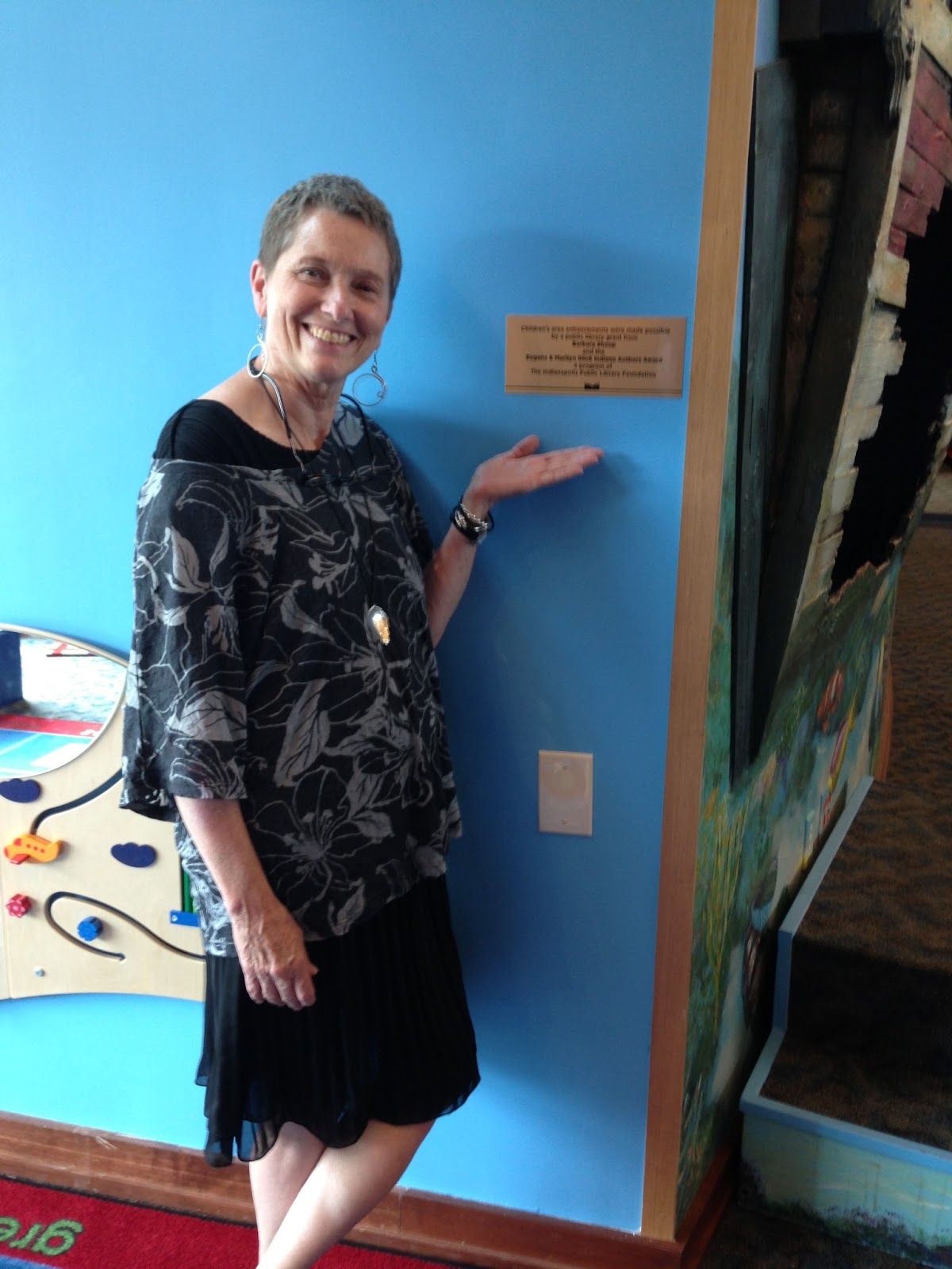 Last fall, I had the great pleasure of donating $2,500 to the branch as a result of winning the 2012 Eugene and Marilyn Glick Regional Indiana Authors Award. Yesterday, I got to cut the blue ribbon, officially opening the cozy corner they created for the littlest kids with the money. It has a cool activity wall, a bright alphabet rug, a nifty kid-size armchair next to the story phone, so they can sit and listen to a story—and a brass plaque nearby with my name on it.