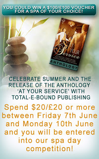 To celebrate the release of the At Your Service Anthology, my publisher Total-E-Bound is giving you the chance to enter their fabulous prize draw. Spend $20/£20 or more and you will be automatically entered into a draw to win a Spa day voucher!