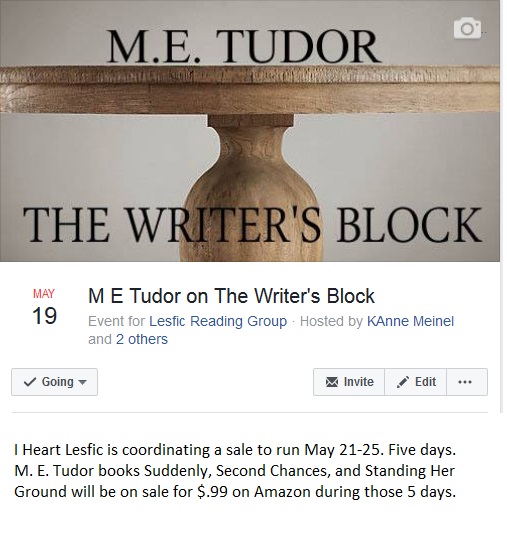 Next Saturday I'm going to be on The Writer's Block that is hosted by the Lesfic Reading Group. I hope a lot of people will stop by and ask questions. I'm going to be giving away digital and print copies of Building Love throughout the event.May 21-25th I Heart Lesfic is having a Mega Sale. My books Standing Her Ground, Suddenly, and Second Chances will all be on sale for $.99 on Amazon during those five days. So, if you haven't purchased a copy of one of those books, here's your chance to get them at a discount.
