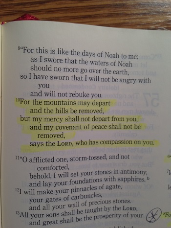 For the mountains may depart and the hills be removed, but my mercy shall not depart from you, and my covenant of peace shall not be removed, says the LORD, who has compassion on you. (Isaiah 54:10)