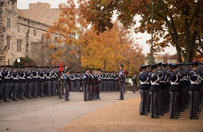 Once back to our apartment with the purchases, Cecil looked over my paperwork to see what I'd have to do next. "You're in Squadron A over at Eggleston Hall which is in the lower quad. They'll be expecting you today. Let's get you fixed up and then you better get on over there and report in." "Fixed up" required the use of all the brass polishing chemicals and implements (especially to make sure my brass belt buckle was real shiny), spit shining my shoes until I could see myself in them - Cecil showed me how and actually did most of it - and tucking my shirt into my pants so that it was flat in the back without any bagging. Cecil also showed me how to use the Spiffy to keep the tabs of the shirt collar straight and properly flat, how to wear the cap squared away with the brim no more than two fingers above my nose, and, lastly, how to walk or, as Cecil put it, to "drag right" and "square corners." This was truly mind-boggling stuff. To drag right meant to keep my right shoulder next to every wall, and to square corners meant to sharply execute a right or left turn any time I wanted to change directions. It was, Cecil said, necessary for rats to always drag right and square corners any time they were in the upper or lower quadrangles where the Corps dormitories (or barracks as they were sometimes called) were located and also inside the dorms themselves. I don't recall if I asked why this was but it didn't matter. It was and that was it. After I got dressed up, my skin crawling beneath the itchy wool of the uniform, Cecil inspected me and said, "I guess it will have to do," and pointed me in the right direction. "You either go now or they'll come after you." I went but not on my scooter. Cecil said it was illegal for a freshman to have a vehicle on campus - something else I'd kind of missed in the literature - so that meant walking. Along the way, which was about a mile, my shirt sort of came loose in the back, and I guess I handled my brass belt buckle a bit leaving behind a greasy fingerprint or two, and I walked through some mud with my shiny new shoes (which hurt, anyway), and the wind blew my cap to the back of my head. I gave none of that any thought. The lower quadrangle, where Squadron A was located, looked like an ancient castle built out of gray stone and just as forbidding. I entered it, found the quadrangle empty, and continued to the dormitory marked with a brass plaque that said Eggleston which was where Squadron A was supposed to be.
