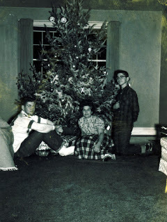 Jim, Mom, and me at Christmas, 1959. Chipper was in the tree. (photo by Dad)