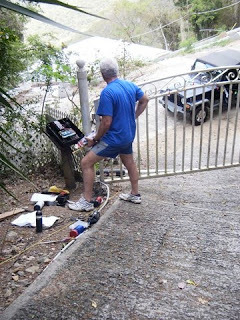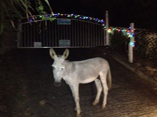 The Gate at Skyridge When we became the owners of the house and property we came to call Skyridge in St. John, U.S. Virgin Islands, it had no gate at the entrance to its driveway which is approximately a mile long (OK, maybe fifty yards) and tilted essentially vertical (it honestly feels that way). Instead of a gate, we found a tangle of ugly orange plastic mesh stretched between two trees. This was, so we were informed, meant to keep the wild donkeys and goats from getting in which was an understandable precaution. The wild donkeys, lovable as they are and icons of the rich history of St. John, are not very good guests because they eat all the flowers within reach of their cute little muzzles and grinding teeth which leaves not only denuded gardens but enormous, stinky poop piles. As for the goats, they also eat the vegetation but have the further habit of falling into swimming pools and drowning. Goat corpses floating in one's pool are not what one wants to wake up to in the morning. The plastic mesh was the previous owner's idea of protecting the property against the armies of donkeys and goats that regularly make forays into the Upper Carolina neighborhood of Coral Bay. That meant every time we wanted to go anywhere, I had to hike down the driveway and pull the mesh back and then, after driving the car through, get out and stretch it across the driveway again. When we returned, the process had to be done in reverse, pulling the mesh back, driving up the driveway to park, then walking down to pull the mesh across the driveway again and tying it off. Not only did it require the stamina of your average Olympic long-distance runner but the mesh was ugly as sin and, anyway, didn't always work. The donkeys and goats often just hopped over it or mashed it down and came on up to see what they could see and eat what they could eat. That invariably meant many hours of work cleaning up donkey and goat poop, not to mention having to get new plants. Fortunately, no goats drowned after hopping the mesh but chasing them away was a pretty daunting exercise. Far faster and nimbler than any human, they were quite willing to be chased around the house as many times as I was able and still be ready to give it another go. Ultimately, it always took Linda and me in a coordinated effort similar to calling a Hail Mary play in a pro football game to get them headed down the driveway. One morning, even before we had time for a cup of coffee, we looked out from the deck and saw six goats in the driveway, contemplating life and our flowers. We rushed to defeat them. "You go left, I'll go right, yell, clap your hands, and herd them!" I cried as the goats looked placidly on, only reluctantly moving after we came after them. Even when we got them going more or less in the right direction down the driveway, they simply scattered into the trees, there to meander and giggle to themselves while probably also calculating how they might get into the pool to drown. Eventually, we got them down the driveway and I pulled the mesh tight. Hot and sweaty, I climbed back up the driveway to sit down on the steps and give the problem some thought, not the immediate goat problem but the problem problem. After a bit, I proudly announced to Linda my solution. "What we need is a gate!" "We have a gate." "That's a strip of mesh. I mean a real gate. You know, built out of maybe aluminum. With real hinges so it swings open and closed." "Sounds expensive," she said. "It will also be expensive when I die of a heart attack going up and down the driveway or we have to drain the pool to get out a dead goat." She pondered that. "It would have to be a pretty big gate and you'd still have to go up and down the driveway to open and close it." "No I wouldn't. I'll get an automatic gate opener." I cracked open my laptop and showed it to her, a tubular device bolted to a fine looking gate. A man and a woman were standing beside it. They were smiling and looking generally ecstatic about their gate and its opener. "Behold," I said grandly, "the Heaving Horse, the finest little gate opener in all the land." Linda peered over her reading glasses at the screen. "The Heaving Horse?" "That's its name." "Is that really its name?" "You betcha." Note to readers: It's not actually its name but I'm just trying to be nice here. "I know a fellow who will build the gate for us," I went on. "I don't know . . . " "Oh, come on. You worry too much. Trust me, it'll be great!" Linda arched an eyebrow but then nodded her assent and, before long, that fellow delivered up a fine big aluminum gate hung on a steel post. I was so proud. "I thought there was going to be an automatic gate opener," Linda said from the car as I trudged down the driveway to swing open our fine new gate. "The Heaving Horse has been ordered," I said over my shoulder. "I will install it the next time we come down." Indeed, just as I claimed, after we returned to Huntsville, the Heaving Horse arrived in a package. I peeked at it, saw it looked exactly as it did on the company's website plus also a black box filled with electronics and some power cordage. I didn't read the instructions in its thick manual. I was confident I would figure it all out when I got back to St. John. When we next arrived, I got busy installing the Heaving Horse. My buddy Wayne came over and inspected the assembly. "Where's the battery?" he asked. "We don't need a battery," I said. "We'll hook it up to the house power." "I think it has to operate off a battery. Look there in the control box. See that slot? That's for the battery." I shook my head and triumphantly held up the power cord coming out of the box. "This takes AC power. See? It says right here in the manual. Or at least, that picture shows it." Wayne took the instructions away from me and stared at the picture, then read the words beneath it. "Homer, what the electronics does is take the AC power to pump up the battery, and then the battery opens and closes the gate