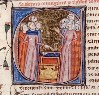 It got me thinking about the difference between children’s clothing now and in the past; how these clothes were designed to allow babies to move and breathe, whilst being bright and fun, in contrast to the restrictive swaddling and mini-adult suits that we see being inflicted on infants in past decades.For the first year of their lives, babies were immobile, bound tightly in swaddling bands and lain in cots, partly for their own safety. Unable to flail around, crawl or walk, these strips of cloth or linen were little more than torn pieces of sheet, often in white or green and bore little resemblance to the stretchy baby grows and soft suits made from cotton or towelling.These two images from the mid fourteenth century show a small baby bound in thick blue material, with only its face visible, followed by a much older infant, perhaps aged one, literally tied into its crib with green strips.