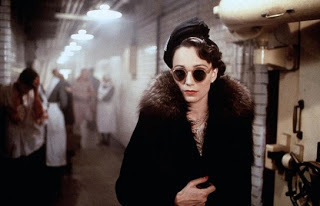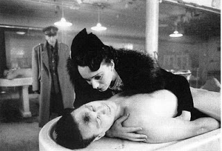 The double doors in the middle of the scene open and she appears. Only a dark silhouette at first, she steps into the room; a slim young woman dressed in a black coat with a large fur collar, glamorous with her lipstick, pearls, heels and dark glasses. Yet it is clear from her demeanour that she is in mourning. Reaching behind her, she pulls the door firmly shut before the camera draws close, foregrounding her face as she removes her glasses. Her expression is an uneasy mixture of subdued horror and resignation. The scene before her is a mortuary. Three bodies lie on marble plinths in a low-ceilinged room where the windows have been shortened with plaster board, making it feel subterranean. She approaches the dead, with her form bathed in shadow, and stops before the corpse of a young man. He lies white and maimed, visibly wounded on the forehead and chest. She leans on the plinth as if the sight of the corpse weakens her, before taking it in her arms and delivering her speech.