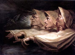 Shakespeare's witches from MacbethEleanor’s oath forbade her from retaining such items as the caul, placenta and umbilical cord, even body parts, like Shakespeare’s “finger of birth-strangled babe,” delivered in a ditch. There was a particular traffic in cauls, as these were believed to have powers to protect the bearer from drowning, so they were much sought after by sailors. We also have Faustus at one stage proposing to build an altar and a church to Beelzebub and offer him “lukewarm blood of new born babes.” Many of the herbs associated with childbirth, which were used by midwives came with associated rituals, such as being picked in moonlight or at midnight whilst a charm was muttered. Thus, the midwife, who was usually a woman of experienced years, also a repository of women’s secrets and skills, could easily attract an accusation of witchcraft. In 1566, when the future James I was born in Scotland, an attendant to his mother, Mary Queen of Scots, is reputed to have used sorcery to attempt to divert her labour pains to another woman.
