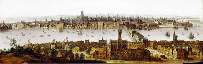 The Scottish poet William Dunbar, who visited the “sovereign” city of London in 1501-2, compared it with the city of Troy. His pleasant beryl-coloured Thames throngs with swans and sailing barges, running under bridges with white pillars. In the streets, merchants and knights appear dressed in velvet gowns with chains of gold; it was a beautiful city full of wise, attractive inhabitants: the merchants’ wives were fair and “lovesom, white and small” while the girls were “clear” which suggests good health, “but lusty.” The merchants’ modern dwellings spread upwards rather than outwards, several storeys high, with their glazed windows, painted mortar and timber.