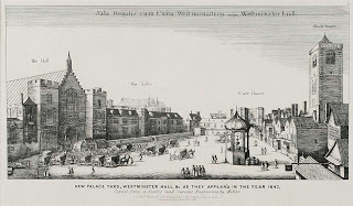 Engraving of Westminster Palace as it appeared in 1647Beyond the confines of Westminster, the narrator is offered strawberries, cherries, pepper and spices, hot sheep’s feet, mackerel, rushes, pies and peasecods as well as fine velvet, silk, lawn and Paris thread. What could be seen of the Palace in the 1470s was mixture of medieval architectural styles, building on the foundations laid by Edward the Confessor. Closely connected with the Abbey, much of the ceremonial business took place in the Great Hall and painted chamber, while the royal apartments formed a right angle overlooking the river and gardens. It was a peaceful location, as the opposite bank was marshy and undeveloped, save for the view of Lambeth Palace. From the steps, Richard could take a barge downstream into the city itself, past the backs of aristocratic homes, along to the imposing white bastion of the Tower.