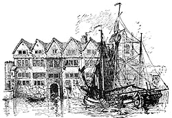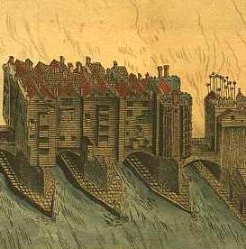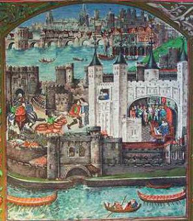 The Tower of London, from a C15th MSSeveral great houses of London were also known to Richard through his family connections. His brother George, Duke of Clarence lived at Coldharbour House in Thames Street, in the parish of All-Hallows-the-Less, or perhaps All-Hallows-in-the-Hay, named after an adjoining hay wharf, near where the London Brewery now stands. It was an ancient and important “right fair and stately” house, according to John Stowe, originally two fortified buildings on the river front, which had been home to Henry IV in 1400 and to Henry V during his tenure as Prince of Wales. Following the attainder of Anne of York’s husband, Henry Holland, the property came into the possession of the crown and was used by various members of the York family. It is mentioned in a mid-seventeeth century play, by Heywood and Rowley, as having twenty chimneys, and was reputed to have a number of turrets built around a courtyard and believed to be impregnable. In the 1460s it had been owned by the Lancastrian Henry Holland, Duke of Exeter, but was confiscated after his involvement in the Battle of Barnet.