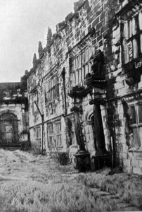 ‘Originally the gateway opened into a courtyard and later on to a paved path leading to the main door. The path is now overgrown with grass and weeds and littered with empty milk bottles, rusty cans and broken chair legs. The pillars to the entrance of the main door are leaning at a precarious angle. Above them were two statues: one survives, disfigured almost beyond recognition; the other, broken into three pieces, has fallen to the ground alongside the rusty frame of a discarded motor cycle. The visitor who ventures through the interior of High Sunderland will find desolation reminiscent of a bomb-shattered building. No windows exist; some of the window spaces have been boarded up but the wood has rotted. The floors are littered with broken stonework, splintered rafters, tiles and here and there pieces of abandoned furniture. Rubbish has, in fact, been discarded indiscriminately, most likely when the last tenants vacated the building. It is unsafe to subject the walls to any weight for they are likely to crumble. The only light in some rooms comes from large holes in the roof and through missing stones in the wall. The uncanny howl of the wind as it whips though gaps in the stonework produces an atmosphere that chills and depresses.’