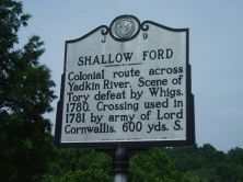 The Shallow Ford, located some 15 miles west of Winston-Salem, North Carolina, is,a shallow section of the Yadkin River which, in colonial times, afforded a safe place for travelers to cross. The ford is formed by a sand and gravel bar. Upstream from the ford, a stretch of hard rock crosses the river and below the stretch of rock the gradient decreases, reducing the strength of the current and depositing sediment creating the bar that forms the crossing. It provided a natural game crossing and fish trap, which was used by the Indians. By 1748, six families had settled near the ford. Within two years a ferry and tavern operated there. Soon Moravians settled nearby and cut the first road to the ford and over the years several others were cut, making it a transportation hub of sorts. By the time of the American Revolution, the Shallow Ford was a focal point for travelers. While the Yadkin River could be crossed at other fords and ferries, heavier wagons could cross at only two places: the Trading Ford, near Salisbury (Rowan county), and the Shallow Ford (Surry county). Several roads converged on both sides of the river.That humble crossing would be the instrument of a little heeded but important event in shaping the outcome of the war.